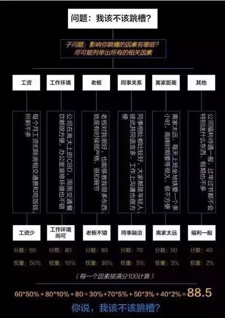 举个例子,比如你现在遇到的问题是:“我该不该现在跳槽?” 那么对这个问题的分解可以如下图所示: