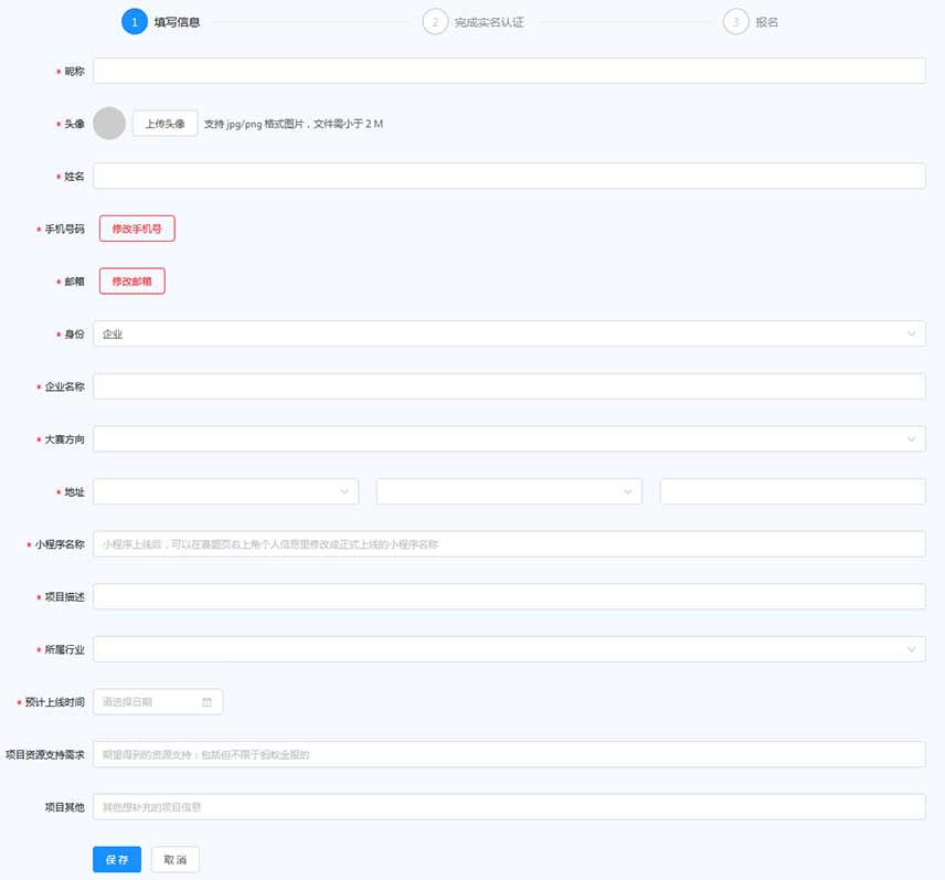 企业名称、地址、项目描述等按实际填写,个人信息可以在报名成功后重新编辑和修改。