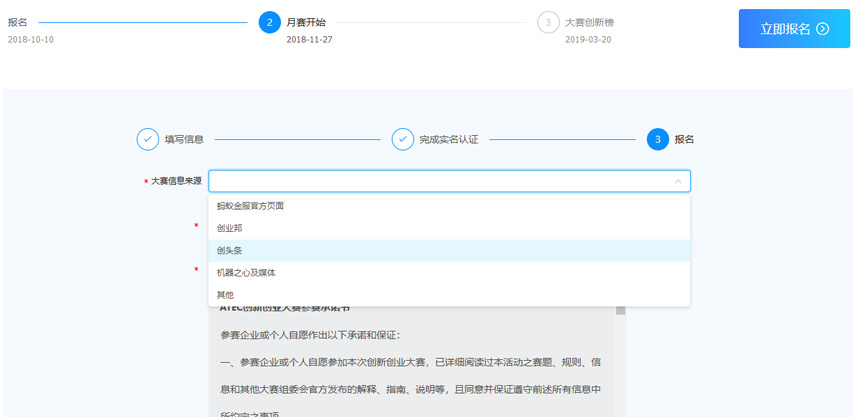 6.通过实名认证后请选择大赛信息来源为创头条,阅读蚂蚁金融科技产品及服务协议以及大赛协议,点击报名即报名成功。