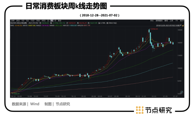 从日常消费板块周k线走势图可以获悉,日常消费板块从2018年底至今年初涨势十分喜人,可将其上升趋势大致划分为几个波段,2019-01-04--2019-04-30的快速爬坡期,2019-05-01--2020-03-20的平台整理期,2020-03-21--2021-02-10的波段上升期(因该基金在此区间内持仓量极少,故不再做波段细分),故而据此分析,该基金在2019-06-30显示的日常消费达到峰值后,受该板块的回调+震荡盘整影响,开始持续减仓,单从整体板块来看,也许此举也错失了后续的部分超额收益。