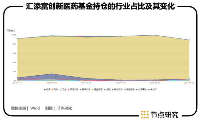 进一步我们来看汇添富创新医药持仓的行业占比及其变化,在近三年里医疗保健行业无意外的以绝对比重占据第一,始终在80%以上,去年年底达到峰值97.61%,今年开始不断收缩至2021-06-30的85.05%。其他的变化,我们可以看到在2018、2019占比较为显眼的日常消费不断减少,2021-06-30已不足1%。