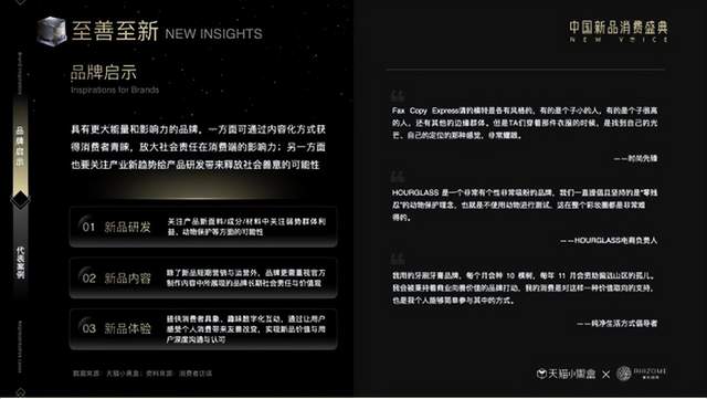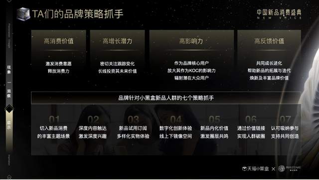结合八大未来新品关键词和小黑盒新品⼈群洞察,《2023线上新品消费趋势报告》报告提出,全链路新品经营已经成为品牌资产沉淀、⼈群资产积累和经营增长确定性的关键,同时,品牌在新品经营方面也应坚持长期主义,在研发与定位、孵化与测试、种草与试用、爆发与续销等四个主要上新阶段期间,需要注重科技智造研发,借力测款工具储备核心用户,全域种草的同时布局全域导购,才能收获持续良性经营。天猫新品经营方法论为品牌提供了2023年新品策略指引,这一策略在天猫小黑盒的资源加持下,将助力品牌抓住机遇、实现突围,并进而实现长期持久的增长。