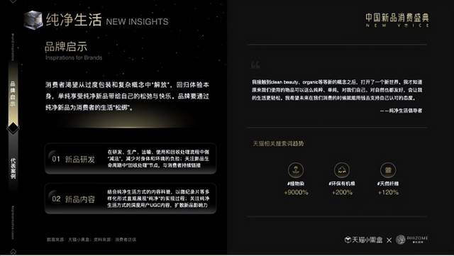 纯净生活:自然、简单、纯净的新品正在重构生活的美好。消费者不仅希望看到纯净的成分配料表,对运输、回收等全流程,都在期待尽可能减少对身体、环境的负担,品牌要通过纯净新品为消费者的生活“松绑”。