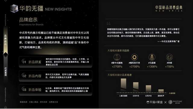 天猫搜索词趋势中,新中式旗袍上升2700%,马面裙上升1300%,国潮持续升温,传统文化逐渐融入大众消费。华韵无疆,品牌要打破民族与传统“疆界”,深度演绎中式生活哲学、气韵和中华文化想象,将中华文化沉淀千年的艺术魅力和精神价值推广至世界舞台。